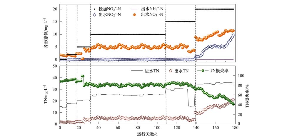 圖 2為各工況條件下,投加不同濃度亞硝酸鹽后反應器出水各形態氮及總氮的去除情況. 從中可知,在反應器運行的178 d內,出水NH4+-N始終未檢出,去除率達100%; 對各運行工況的周期監測也顯示,NH4+-N在60 min均已徹底降解(未給出),說明本研究采用的FNA濃度對NH4+-N的去除沒有影響,對比發現,本研究FNA最高濃度(以HNO2-N計,下同)為1.94×10-3 mg ·L-1,與已有報道的AOB活性受抑制程度為50%時對應的FNA濃度相差近100倍[14],進一步證明常規污水處理廠由亞硝酸鹽積累所得FNA對AOB的增殖與產能代謝活動影響甚微. 此外,亞硝酸鹽投加量為0-15 mg ·L-1范圍內,系統出水中殘留的NO2--N量均小于0.1 mg ·L-1,出水NO3--N積累量則隨著好氧初始階段NO2--N投量的加大而增多,最高投加量對應的平均值為5.11 mg ·L-1,總氮損失率一直保持平穩,均高于80%. 亞硝酸鹽投量提升至20 mg ·L-1后,出水逐步出現NO2--N的積累,平均值達4.75 mg ·L-1,NO3--N平均積累量也升至9.77 mg ·L-1,總氮損失率僅為56.88%.