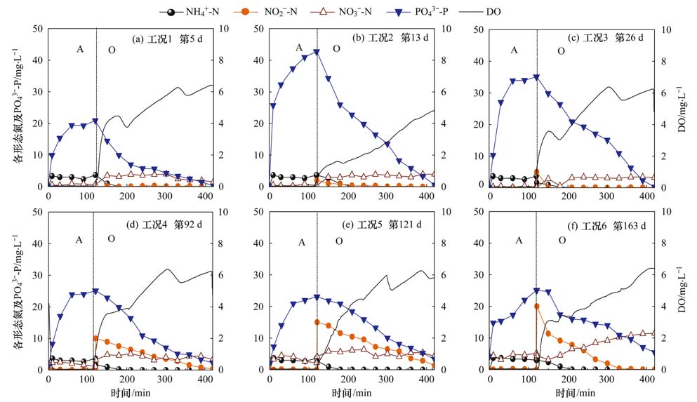 圖 4為不同工況下系統典型周期內PO43--P和各形態氮及DO的濃度變化規律. 從中可知,試驗進行的6個工況內均有釋磷和吸磷現象且最大釋磷濃度出現在厭氧結束時刻. 在各工況厭氧時段內,DO濃度維持在極低范圍,即0.02 mg ·L-1左右,PAOs將體內聚磷以正磷酸鹽的形式釋放出來并產生能量,進而利用該能量吸收混合液中的揮發性脂肪酸(VFAs)并以聚羥基脂肪酸(PHAs)的形式貯存在體內; 在此期間,NH4+-N濃度由于活性污泥的吸附作用有小幅降低(<1 mg ·L-1). 好氧時段內,DO濃度從0.02 mg ·L-1快速升至2 mg ·L-1以上,PAOs以降解PHAs為能量來源實現微生物生長、 糖原合成以及磷的過量吸收; NH4+-N被快速降解轉化為NO2--N,并最終轉化為NO3--N. 工況1中,即系統的啟動階段,厭氧段結束時的磷濃度為25.14 mg ·L-1; NH4+-N維持在3.35 mg ·L-1以上. 好氧階段,DO濃度快速升高并維持在4-6 mg ·L-1之間,PAOs在反應時間內完成吸磷過程,出水<0.5 mg ·L-1; NH4+-N在有氧條件下快速降解,反應末端出現1.617 mg ·L-1的NO3--N積累. 工況2中,盡管在厭氧段結束時刻向系統內投加濃度為2 mg ·L-1的NO2--N,但厭氧釋磷量較工況1有大幅升高,磷濃度達42.78 mg ·L-1. 分析認為,由于FNA的解耦聯作用,PAOs必須提高呼吸速率,即分解更多的聚磷(Poly-P)以泵出更多質子從而維持質子驅動力(PMF)的恒定. 研究還發現,由于釋磷量的提高導致PAOs在好氧段的負荷增大,但吸磷過程在反應時間內仍能徹底完成,說明PAOs的吸磷能力有所提高; 對好氧初始階段向系統投加的NO2--N濃度測定及數據分析發現,NO2--N投加總量出現95%以上的損失,僅有剩余一小部分轉化為NO3--N,說明NO2--N在好氧階段被除亞硝酸鹽氧化菌(NOB)以外的其他微生物所消耗,但具體被哪種微生物菌群利用及其降解機制仍不明確. 工況3中,NO2--N的投加量提高至5 mg ·L-1,除磷率仍接近100%,說明FNA濃度低于0.53×10-3 mg ·L-1時,系統的除磷性能未受抑制. 工況4,即NO2--N投加量為10 mg ·L-1,換算為FNA濃度為0.99×10-3 mg ·L-1,除磷性能開始出現受抑制現象,表現為厭氧末端磷濃度降至25.13 mg ·L-1且好氧階段吸磷能力減弱,反應結束時仍有2.33 mg ·L-1的PO43--P殘留. 進一步加大NO2--N投加量至15 mg ·L-1和20 mg ·L-1(工況5,6),即FNA為1.46×10-3 mg ·L-1和1.94×10-3 mg ·L-1,抑制現象更加明顯,厭氧釋磷量及好氧吸磷量進一步減少,且系統內NO3--N的積累量逐步提高.