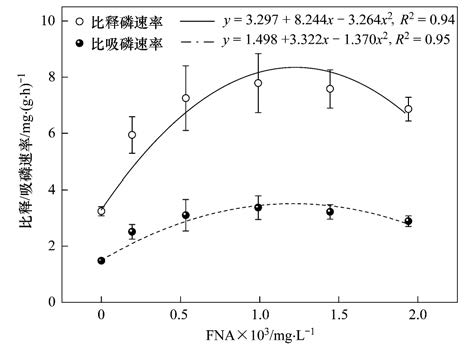 圖 5為不同FNA濃度下,各工況穩定運行時系統的比釋磷速率和比吸磷速率. 從中可見,投加FNA后,反應器混合液的比釋磷速率和比吸磷速率均高于投加前. 結合圖 3不難發現,聚磷菌的釋磷和吸磷能力在短期內會受到FNA抑制,而長期運行其活性會逐步恢復,由此推測,PAOs可能是借還原亞硝酸鹽用以解毒. 對各濃度條件下的比反應速率曲線擬合發現,隨著FNA濃度的增高,系統比釋/吸磷速率呈現先增大后減小的拋物線趨勢,說明低濃度的FNA(<0.99×10-3 mg ·L-1)不僅未抑制污泥的釋磷及吸磷能力,反而起到了促進作用,這一現象可以由FNA的解耦聯作用解釋. 通過對熒光假單胞菌的研究,研究者證實了FNA可以作為質子載體透過細胞膜且在膜兩側往復運動而不產生能量[25, 26, 27],但FNA的解偶聯作用導致其透過細胞膜后胞外驅動質子的能量增加,因此,PAOs必須提高呼吸速率,即分解更多的聚磷(Poly-P)以泵出更多質子從而維持質子驅動力的恒定[28]. 對圖 5的分析還發現,比釋磷速率的標準偏差范圍均大于比吸磷速率的標準偏差范圍,且比釋磷速率的曲線變化趨勢明顯,說明FNA對厭氧放磷的影響大于好氧吸磷.