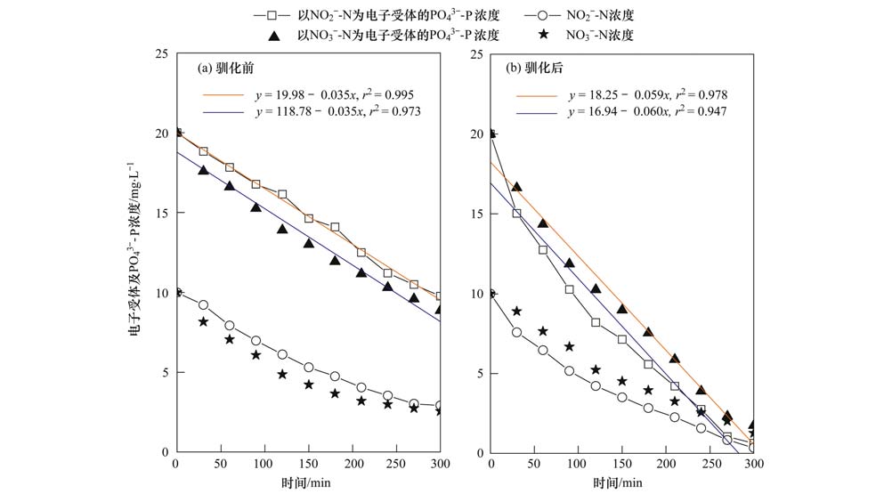 圖 6為系統投加FNA前后以NO2-和NO3-為電子受體的缺氧吸磷試驗中PO43--P和NOx--N的變化規律. 對圖 6(a) 中兩種電子受體吸磷曲線進行線性擬合并分析可知,馴化前,系統以NO2-和NO3-為電子受體的反硝化吸磷均能進行,但NO3-型的比吸磷速率(以VSS計,下同)為7.95 mg ·(g ·h)-1及電子受體比利用速率為5.33 mg ·(g ·h)-1略高于NO2-型的比吸磷速率為7.32 mg ·(g ·h)-1及電子受體比利用速率5.06 mg ·(g ·h)-1,而且,試驗結束時系統中仍有少量PO43--P和電子受體存在. 投加FNA馴化65 d后,對圖 6(b)的分析發現,兩種類型缺氧吸磷的吸磷速率和電子受體利用速率均有大幅提升且污泥的缺氧吸磷方式發生轉變,NO3-型的比吸磷速率26.64 mg ·(g ·h)-1 及電子受體比利用速率12.75 mg ·(g ·h)-1 均小于NO2-型的比吸磷速率28.25 mg ·(g ·h)-1及電子受體比利用速率14.07 mg ·(g ·h)-1,缺氧吸磷能力分別為馴化前的3.35倍和3.86倍. 上述現象說明,向好氧吸磷系統內投加FNA并長期馴化有利于系統內篩選具有以NO2-為電子受體的反硝化聚磷菌.