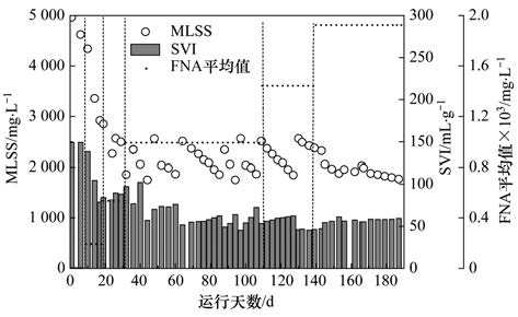 圖 7為FNA投加量對系統內污泥量及其沉降性能的影響. 從中分析可知,試驗進行的前20 d,系統混合液的MLSS值由4 963 mg ·L-1降至3 000 mg ·L-1左右. 分析原因,FNA的抑制作用致使部分微生物被殺滅或細胞增殖量低于排泥量,然而,經過一段時間后,尤其是投加0.99×10-3 mg ·L-1的FNA后污泥濃度趨于平穩,說明系統內污泥進入適應期. 由不同FNA濃度下反應器內污泥體積指數(SVI)的變化可見,隨著試驗的進行,SVI逐步降低直至穩定,這與污泥濃度變化趨勢一致. 分析原因: 一方面,FNA抑制了絲狀菌的生長; 另一方面,圖 4顯示的比釋磷速率和比吸磷速率的增大表明PAOs活性增強或數量增多,因而活性污泥比重較大,更有利于污泥的沉降.具體參見污水寶商城資料或http://www.bnynw.com更多相關技術文檔。