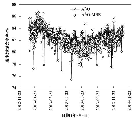 2013年該污水處理廠脫水污泥含水率變化情況如圖 1所示. A2/O工藝和A2/O-MBR工藝的污泥脫水效果均呈現季節性變化特征,6~9月,污泥比秋末、 冬季、 初春更容易脫水. 該時段北京處于汛期,具有降雨量偏多,同時水溫較高的季節性特征,這可能影響了污泥的泥質和脫水性能. 如表 1所示,A2/O工藝和A2/O-MBR工藝的脫水污泥含水率年均值分別為(82.56±1.35)%和(81.92±1.64)%,而在1~5月,兩種污水處理工藝的脫水污泥含水率都超過了83%.