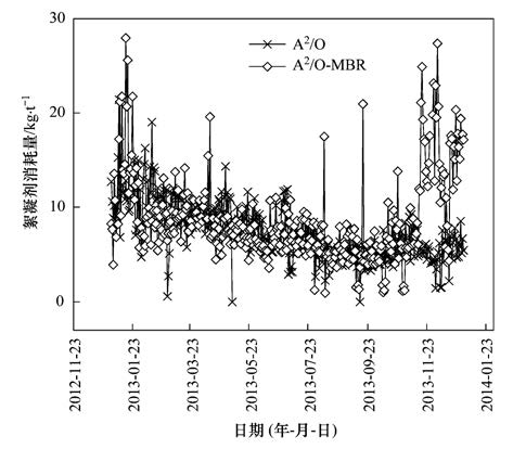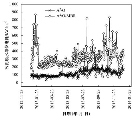 如表 2所示,全年A2/O工藝與A2/O-MBR工藝中污泥脫水絮凝劑的平均投配率(以DS計,下 同)分別為(7.42±2.96) kg ·t-1和(8.70±7.25) kg ·t-1. A2/O工藝脫水污泥絮凝劑的投配率波動相對較小,而A2/O-MBR工藝脫水污泥絮凝劑的投配率波動大,特別在冬季,絮凝劑的投配率不但高,波動也更為明顯,在10~12月末,絮凝劑投配率的方差和變異系數分別達到38.08、 0.594. 根據水廠2013年運營報告,MBR脫水機泥餅產量波動很大,其中,在11月底進行了配電室停電清掃,脫水機停機,使得近幾天的產泥量較低. 此外,8、 9、 10、 12月中下旬出現幾次泥餅產量驟增的情況,固體負荷是影響污泥離心脫水機運行狀態的重要參數. 因此,這可能是導致MBR脫水機藥劑量在秋末冬初波動大的原因. 在數據較為穩定的夏季和秋初,兩種工藝下污泥脫水絮凝劑消耗差別不大. 但是,孫寶盛等[9]在實驗室對比研究了MBR工藝和傳統活性污泥法污泥過濾阻力差異,結果表明,MBR工藝污泥混合液的過濾阻力達到了傳統活性污泥法過濾阻力的2~3倍.
