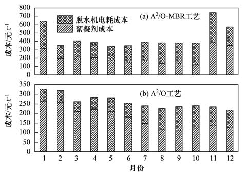 為進一步分析污水處理廠污泥脫水成本,采用單位干重污泥脫水絮凝劑成本和脫水機用電成本進行分析,其中按照絮凝劑(以干粉計)價格23.5元 ·kg-1,用電價格0.698元 ·(kW ·h)-1計算,結果如圖 4所示. A2/O工藝的污泥脫水絮凝劑成本(以DS計,下同)為175.00元 ·t-1,用電成本為84.86元 ·t-1; A2/O-MBR工藝的污泥脫水絮凝劑成本為204.76元 ·t-1,用電成本為231.61元 ·t-1. A2/O-MBR工藝污泥脫水的絮凝劑成本和脫水機電耗成本相對較高.