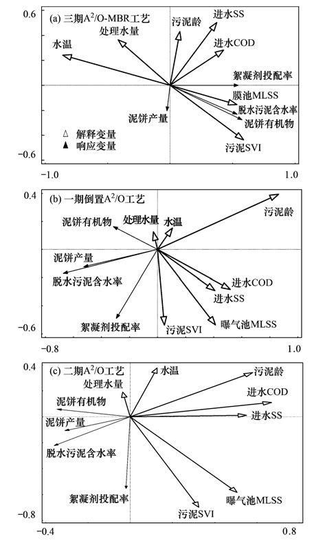綜合考慮,將污泥負荷變量剔除后再次作RDA分析,結果如圖 5所示. RDA排序圖中實心箭頭代表物種(響應變量),空心箭頭代表環境變量(解釋變量),物種變量與物種變量間、 物種變量與環境變量間的夾角余弦值代表了各變量之間的相關性. 因此,物種變量間相關關系表明,A2/O-MBR工藝和A2/O工藝的脫水污泥含水率、 污泥有機質含量以及絮凝劑投配率三者之間呈正相關關系,一方面說明污泥有機質含量是影響污泥脫水性能的關鍵因素之一,同時說明雖然絮凝劑投加量增加,污泥仍然較難脫水. 因此,在污泥泥質變化、 脫水性能變差的情況下,采用提高絮凝劑投加量的控制策略是否經濟有效,值得進一步探討.