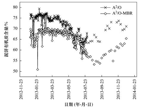 上述分析表明,不同工藝污泥脫水性能受水溫季節性因素影響最為突出,而A2/O-MBR工藝中污泥有機質受水溫影響顯著. 圖 6所示為2013年污泥有機質變化情況. 與脫水污泥含水率相似,兩種工藝污泥有機質含量變化呈現明顯的季節性變化特征,夏季和秋初污泥有機質含量低. 戴曉虎等[13]調研了我國南方某城市七座污水處理廠不同季節污泥有機質含量情況,同樣得到在7~8月,污泥有機質含量最低的結果. 污泥有機質含量對污泥脫水性能的影響,可能與污泥中胞外聚合物(EPS)的變化有關. 因為,EPS是污泥有機質的重要組成成分,已有大量研究報道了污泥EPS對污泥脫水性能的影響. 例如,Wilén等[14]通過對瑞典一座大型污水處理廠(800000人口當量)的調查研究表明,污泥中EPS(胞外聚合物)的含量呈現明顯的季節性變化特征,污泥中EPS含量與溫度呈顯著負相關(rp=-0.71,P<0.001),即冬季污泥EPS含量高于夏季. 這與本研究中污泥有機質的季節性變化特征相一致. 而已有研究證明[15, 16],污泥中EPS含量及其組成對污泥脫水性能有明顯影響. Novak等[16]通過研究污泥分別在厭氧和好氧消化時,蛋白質、 多糖的釋放及其對后續污泥脫水性能和絮凝劑消耗的影響發現,不同處理方式下釋放的蛋白質、 多糖濃度都與后續污泥脫水絮凝劑的消耗呈顯著正相關(R2>0.9). Neyens等[17]綜述了預處理過程(熱處理、 酸堿處理、 Fenton氧化)對污泥脫水性能的影響,結果揭示污泥脫水性能的改善主要是通過預處理對污泥EPS中蛋白質、 多糖的降解,進而改變EPS對水的束縛特性.