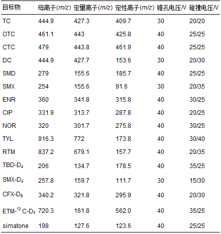 11種抗生素標準品: 四環素、 金霉素、土霉素、 強力霉素、 磺胺甲 唑、 磺胺二甲嘧啶、 環丙沙星、 諾氟沙星、 恩諾沙星、 泰樂菌素、 羅紅霉素購自德國 Dr. Ehrenstorfer GmbH公司; 內標物標準品西瑪通購自美國Accustandard公司; 替代標標準品thiabendazole-d4、 ciprofloxacin-d8、 erythromycin-13 C-d3購自加拿大Toronto Research Chemicals公司. 甲醇、 乙腈為色譜純,EDTA鈉、 檸檬酸、 檸檬酸鈉均為分析純,乙酸鈉、 葡萄糖、 硫酸銨、 磷酸一氫鉀、 碳酸氫鈉、 硫酸鎂、 氯化鐵、 氯化鈣、 氯化鉀、 硫酸亞鐵、 硫酸鋅、 硫酸銅、 鉬酸鈉、 氯化鈷均為化學純,實驗用水為Milli-Q水.