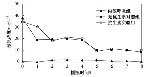 城市污水廠好氧污泥取回后空曝24 h,3000 r ·min-1離心5 min去除上清液,用稀釋水洗滌1次,離心取泥餅放入盛有10 L葡萄糖配水的SBR反應器中,調整污泥MLSS為2 g ·L-1,28~30℃水浴. 運行方式: 曝氣11.5 h,靜置沉淀0.5 h,排水5 L,再重新注入5 L葡萄糖配水,并添加碳酸氫鈉調節pH 7.0~7.5. 連續換水培養10 d后,認為馴化完成. 污泥活性測試分為3組實驗: 內源呼吸組、 無抗生素對照組和抗生素實驗組,分別在添加了600 mL溶液的3個1 L錐形瓶中進行,馴化污泥的初始MLSS 控制在約2 g ·L-1. 內源呼吸組是為了排除污泥解體、 吸附作用等對實驗結果的影響,因此該組使用的溶液只加入了葡萄糖配水中的微量營養鹽成分,不加碳氮磷成分,也不添加四環素; 無抗生素對照組是為了觀察不受抗生素污染的污泥對常規水質指標的降解狀況,因此該組溶液中加入葡萄糖配水,不加四環素; 抗生素實驗組是為了觀察受到抗生素污染的污泥對常規水質指標的降解狀況,溶液中加入葡萄糖配水,并添加20 mg ·kg-1四環素. 三組錐形瓶均用雙層透氣紗布封口,于轉速130 r ·min-1、 溫度30℃的恒溫水浴搖床內振搖充氧. 實驗開始后每隔1 h取10 mL水樣,監測TOC和氨氮的濃度減少情況.