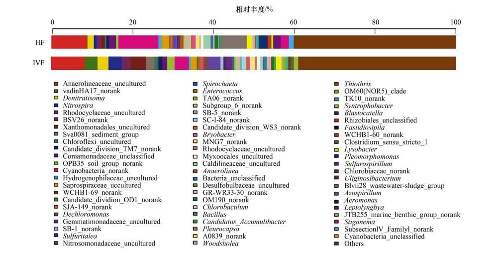采用高通量測序對兩個人工濕地基質樣品微生物中的細菌進行測試,可進一步分析細菌群落結構組成的差異.不同樣品按照“門”的群落結構如圖 5所示.在所有的濕地樣品中,變形菌門(Proteobacteria)的豐度最高,綠彎菌門(Chloroflexi)、擬桿菌門(Bacteroidetes)、酸桿菌門(Acidobacteria)、綠硫細菌(Chlorobi)和厚壁菌門(Firmicutes)的豐度也較高.研究中發現變形菌門是主要的門類,這與人工濕地及活性污泥中均類似[24],因為變形菌門包括很多與碳、氮和硫循環中相關的細菌[25].