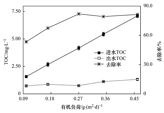 與生活污水不同,天然水體中的有機組分含量低,可生物降解性能相對較差.本研究通過向混凝前的水中投加不同濃度的乙酸鈉(難降解有機組分)調(diào)節(jié)系統(tǒng)的有機負荷,以期所得研究結(jié)果可與實際情況相吻合. 圖 3為不同有機負荷條件下,一體化生物凈化裝置對水中有機組分的去除效果.從中可知,隨著系統(tǒng)進水有機負荷的增加,裝置處理出水中的TOC含量呈現(xiàn)一定程度的上升趨勢,但絕對增加量并不顯著.當系統(tǒng)有機負荷為0.1 g·(m2·d)-1時,處理出水中有機組分的殘留量(以TOC計,下同)為0.73 mg·L-1;當有機負荷增至0.46 g·(m2·d)-1時,有機組分的殘留量約為1.32 mg·L-1.這表明一體化生物凈化沉淀裝置對系統(tǒng)進水中的有機組分負荷波動具有一定的抗沖擊能力.這一性能從有機組分的去除率上觀察則更為明顯,即隨著系統(tǒng)進水有機負荷的增加,TOC的去除率呈現(xiàn)明顯的上升趨勢,由0.1 g·(m2·d)-1時的53.4%迅速增至82.0%,而后則相對穩(wěn)定.這表明當進水有機負荷在0.27 g·(m2·d)-1以上時,系統(tǒng)的抗沖擊負荷能力開始出現(xiàn)下降.控制系統(tǒng)進水有機負荷在0.27 g·(m2·d)-1以下,有利于保證有機組分去除的穩(wěn)定性.