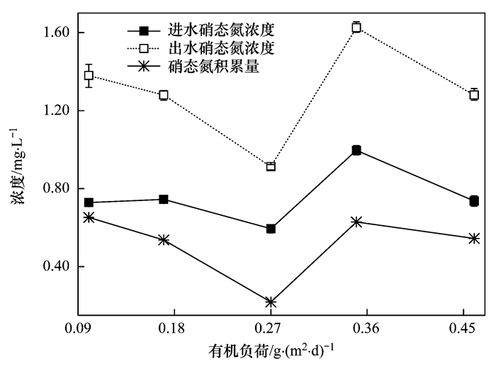 反硝化則主要是由異養(yǎng)菌在缺氧環(huán)境中完成的,以有機物為電子受體和營養(yǎng)源,若有機組分含量不足,將抑制反硝化過程的進行[23].由圖 5可知,裝置出水中的硝酸鹽氮濃度隨進水有機負荷的變化出現(xiàn)一定波動.當進水有機負荷小于0.27 g·(m2·d)-1時,出水中硝酸鹽氮的濃度與進水有機負荷正相關(guān);而當進水有機負荷在0.27 g·(m2·d)-1以上時,出水中的硝酸鹽氮濃度與進水有機負荷呈現(xiàn)負相關(guān)關(guān)系.這可能是由于碳源投加量較少時,反硝化菌與其他異養(yǎng)菌競爭有限碳源時更具優(yōu)勢[7],隨著有機負荷的增加,系統(tǒng)中異養(yǎng)微生物生長優(yōu)勢則強于反硝化細菌,使處理出水中的硝酸鹽氮含量上升.