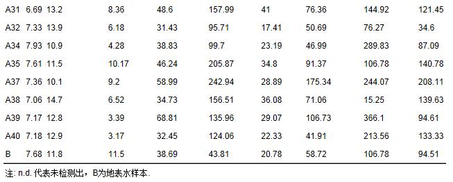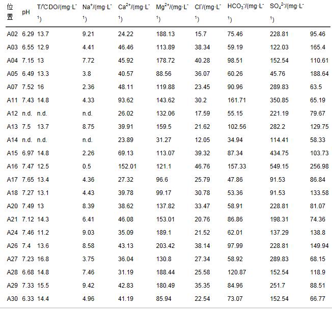 表 1 研究區水樣現場測量參數以及主要的陰陽離子濃度