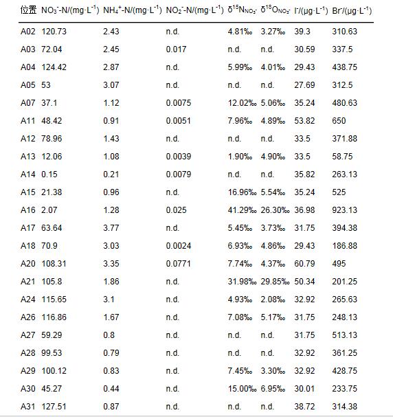 表 2 研究區地下水中的δ15NNO3-、δ18ONO3-、三氮和鹵素含量