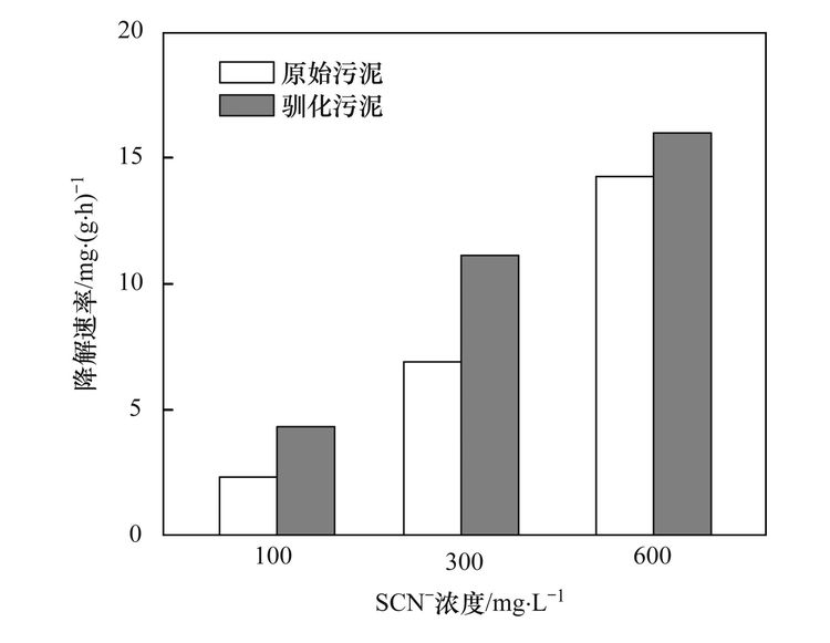 分別取適量經(jīng)沉淀濃縮的新鮮活性污泥和100~600 mg·L-1 KSCN馴化富集的活性污泥于有機(jī)玻璃反應(yīng)器中,加入用自來水配置的濃度分別為100、 300、 600 mg·L-1的KSCN水溶液,使其污泥濃度為3~5 mg·L-1,在溫度為31℃條件下充分曝氣定時(shí)取樣,檢測(cè)活性污泥對(duì)SCN-的降解能力. SCN-的測(cè)定方法參照文獻(xiàn)[17].