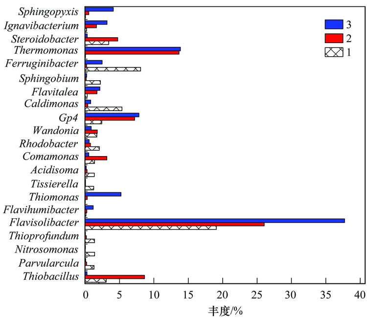 細(xì)菌群落結(jié)構(gòu)在屬水平上的組成和豐度(每種屬的豐度至少在一個(gè)樣品中不小于1%)表明(圖 5): 3個(gè)污泥主要的屬為20個(gè),不同屬在不同污泥樣品中的豐度不同,有些菌的豐度會(huì)隨SCN-濃度的升高而提高,有些菌株的豐度會(huì)隨SCN-濃度的升高而降低,結(jié)果類似于門和目分類得到的結(jié)論,進(jìn)一步說明細(xì)菌種群對(duì)不同SCN-濃度脅迫下有一定的適應(yīng)性,群落結(jié)構(gòu)可以通過自身的組成變化適應(yīng)不同的SCN-濃度環(huán)境. Flavisolibacter、 Ferruginibacter、 Caldimonas、 Steroidobacter、 Thiobacillus和Gp4,為100 mg·L-1 SCN-培養(yǎng)的污泥樣品中主要的屬,F(xiàn)lavisolibacter、 Thermomonas、 Thiobacillus、 Gp4、 Steroidobacter和Comamonas,為300 mg·L-1 SCN-培養(yǎng)的污泥樣品中主要的屬,而600 mg·L-1 SCN-培養(yǎng)的污泥樣品中主要的屬為Flavisolibacter、 Thermomonas、 Gp4、 Thiomonas、 Sphingopyxis和Ignavibacterium. Flavisolibacter可能參與聚羥基脂肪酸酯的合成[25],而Thermomonas在50℃生長(zhǎng)的能力有助于細(xì)菌細(xì)胞壁組分的修飾,如蛋白質(zhì)和(糖)脂質(zhì)的化學(xué)修飾[26],自養(yǎng)微生物Thiobacillus 和Thiomonas可利用H2S作為能源生長(zhǎng)[27]. 焦化廢水中分離出Thiobacillus 和Acremonium菌株能以SCN-為唯一碳源和能源生長(zhǎng)[28, 29],本研究未發(fā)現(xiàn)Acremonium的存在. Thiobacillus普遍存在于含SCN-的廢水處理系統(tǒng)中,可有效降解SCN- [11],Thiobacillus為100 mg·L-1和300 mg·L-1 SCN-培養(yǎng)的污泥樣品中的優(yōu)勢(shì)菌,豐度分別為3.07%和8.63%,而在600 mg·L-1 SCN-培養(yǎng)的污泥樣品中的豐度僅為0.27%,表明在SCN-濃度<300 mg·L-1時(shí)Thiobacillus可能是SCN-主要的降解菌,然而SCN-濃度>300 mg·L-1時(shí),可能有其他菌群參與SCN-的降解,如Arthrobacter、 Bacillus、 Escherichia、 Klebsiella、 Methylobacterium、 Ralstonia和Pseudomonas為SCN-降解菌[30],除Escherichia和Methylobacterium外,這些SCN-降解菌在本實(shí)驗(yàn)中均已經(jīng)檢測(cè)出來,然而其豐度很低,推測(cè)這些低豐度的SCN-降解菌可能在高濃度SCN-下發(fā)揮協(xié)同降解作用. 另外,不同的細(xì)菌具有不同的污染物降解功能,同一種細(xì)菌也可具有降解多種不同污染物的功能,如Comamonas菌可降解酚類、 PAHs和雜環(huán)類物質(zhì)(如吲哚、 喹啉)等[16]; Thiobacillus不僅能降解SCN-,還具有很強(qiáng)的反硝化能力[31]; Pseudomonas可降解SCN-、 酚類化合物、 苯、 甲苯和PAHs等,同時(shí)具有硝化和反硝化的能力[32~35]. 污泥是一個(gè)復(fù)雜的微生物群體,焦化廢水中SCN-的降解可能是多種菌群共同作用的結(jié)果,菌群間復(fù)雜的相互作用關(guān)系還有待進(jìn)一步研究.具體參見污水寶商城資料或http://www.bnynw.com更多相關(guān)技術(shù)文檔。