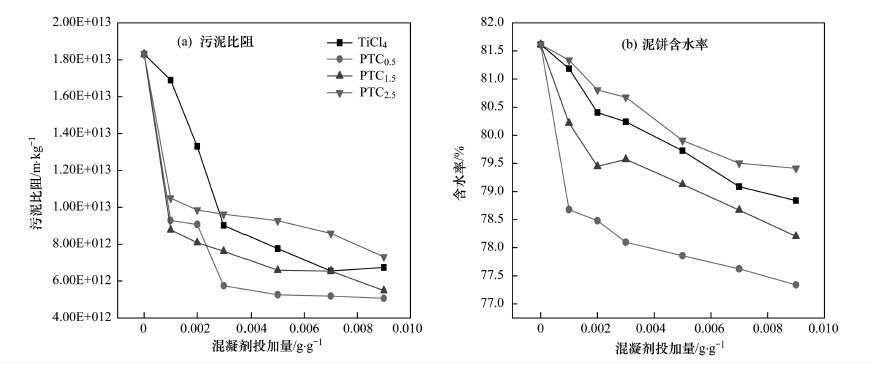 傳統的改善污泥脫水效果的方法有污泥物理調理法和化學調理法,化學調理法因其操作簡便、 價格低廉、 效果顯著成為最常用的方法之一. 常用化學調理藥劑有PAC、 FeCl3和PAM等,主要是通過電中和架橋作用促使污泥顆粒絮凝來改善污泥脫水性[8, 9]. 無機調理劑對過濾速度的提高不如有機調理劑,但是其“骨架”作用也能達到良好的脫水效果[10]. 四氯化鈦TiCl4是一種新型的混凝劑,且鈦沒有毒,對生態環境沒有影響,因此TiCl4作為一種新型水處理劑受到人們的廣泛關注[11, 12]. Shon等[13, 14]使用四氯化鈦為混凝劑去除水體中顆粒物及有機物,研究發現TiCl4與鋁鹽和鐵鹽混凝劑一樣可有效地去除水體中的顆粒物和有機物,且TiCl4較鋁鹽和鐵鹽混凝劑具有形成的絮體大、 絮體沉降速度快,且投加量較二者要少很多等優點. 此外,從經TiCl4處理后的化學污泥中通過高溫煅燒還可以制備出TiO2材料[13~15],是很好的環境友好型光催化劑. 所以,鈦鹽混凝劑的研發符合當代環境保護工作的要求,是一種具有廣闊應用前景的綠色環境治理技術. 而且TiCl4在污泥處理方面以及其混凝機制以及絮體特征還鮮有報道,由于TiCl4本身的水解作用以及本身的強酸性會釋放出大量的H+,而且無機高分子絮凝劑具有凈水效果好、 投資量少、 形成的絮體沉淀性能好、 產生的污泥量少和適應性廣等優點[16].
