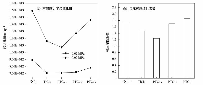 不同B值PTC投加量對污泥脫水性能的影響如圖 1. 從圖 1(a)中得知,經鈦鹽混凝劑調理后,污泥比阻SRF逐漸下降,當投加量以TSS計,為0.001~0.005 g ·g-1時污泥比阻SRF值劇減,大于0.005 g ·g-1時SRF值基本保持不變. 從圖 1(b)中可以看出經PTC調理后泥餅含水率變化規律基本與污泥比阻SRF變化一致. 由以上分析可知,隨著堿化度B的增大污泥脫水性能呈下降趨勢,PTC0.5混凝效果最佳,污泥脫水性最好. 這可能是由于,隨著堿化度B的升高,鈦的水解度越來越高,當堿化度超過1.5時鈦的聚合物不穩定會出現一定程度的分解[17]. 與TiCl4相比,PTC在混凝過程中能夠較少H+的釋放,混凝效果也會強于TiCl4,且在一定程度上解決了TiCl4在混凝過程中出水pH較低的問題. 圖 2為最佳投加量0.005 g ·g-1時不同B值PTC調理對污泥可壓縮性的影響. 圖 2(a)為壓力為0.05 MPa和0.07 MPa時對應的污泥比阻值,由圖中可以看出相比原泥,隨著PTC中B值的升高SRF先降低后升高,PTC0.5 SRF值最低. 圖 2(b)為不同堿化度PTC對應可壓縮性系數,從中可以看出其變化規律與污泥比阻值一致,PTC0.5調理后污泥可壓縮性系數最低為1.24,表明經PTC0.5調理后污泥泥餅比其他B值PTC調理后結構更堅實,更容易壓縮,因此更易脫水.