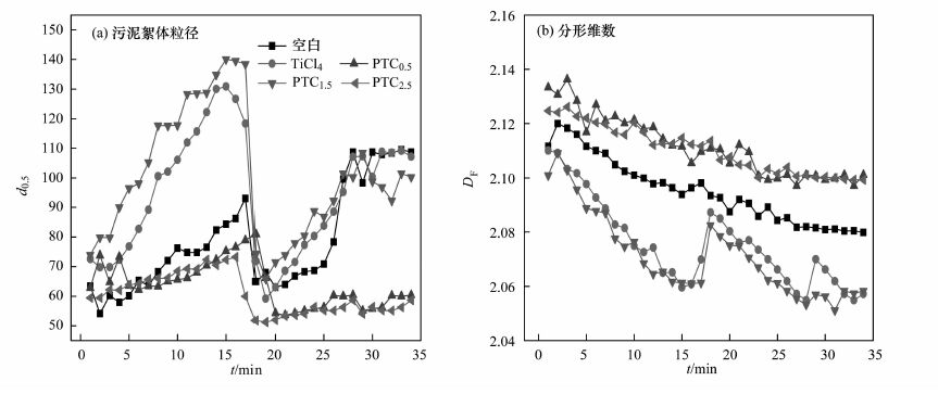 從圖 3(a)中可以看出,不同B值PTC化學調理后污泥絮體粒徑差異較大. 攪拌速度發生改變時,不同B值條件下的PTC混凝劑所產生的絮體呈現出不同程度的破碎和再生,隨著混凝過程的進行,絮體粒徑逐漸增大,慢攪階段結束后,絮體粒徑明顯增大,達到穩定階段,這表明絮體聚集和破碎之間趨于平衡[22]. 當攪拌速度達到400r ·min-1絮體粒徑迅速減小,1 min后恢復轉速為40r ·min-1絮體粒徑又逐漸增大. 其中PTC1.5和TiCl4調理后污泥絮體粒徑要比PTC0.5和PTC2.5大,因此具有很好的沉降性. 從圖 3(b)中可以看出經PTC0.5和PTC2.5調理后污泥絮體的DF值會增大,而PTC1.5和TiCl4調理后污泥絮體DF值反而降低. PTC0.5調理污泥后絮體分形維數最大,一般而言分形維數DF值在1~3之間,其值越大絮體結構越規則. DF 接近3的絮體比較密實,而結構越松散的絮體DF值也更接近1[23]. 這說明其絮體結構強度也更高,結合更緊密,更適合于高壓脫水,因此相應的污泥脫水性能也較好.
