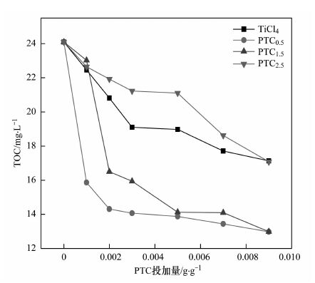 從圖 4中可以看出,相比原泥經混凝劑PTC調理后污泥中溶解性有機碳(DOC,通過TOC變化反映)含量迅速降低,當投加量達到0.005 g ·g-1時趨于穩定,對比4種混凝劑調理后DOC含量可知,PTC0.5調理后DOC含量最低,其次為PTC1.5、 TiCl4,而PTC2.5調理后DOC濃度最高,這與污泥SRF值變化規律一致. 可知混凝劑PTC對EPS有很好的去除作用,這也是污泥脫水性能提高的關鍵因素.