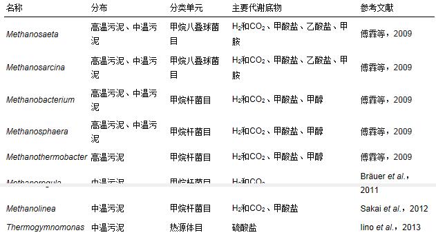 表 3 厭氧活性污泥中優勢古菌的分布、分類單位和主要代謝底物