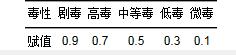 步驟1:建立污染事件與歷史案例屬性指標(biāo)矩陣(1).具體屬性指標(biāo)包括:污染物的類(lèi)型、污染物的來(lái)源、污染物的超標(biāo)倍數(shù)、與下游取水口的距離、污染物的毒性、污染物的危險(xiǎn)性、污染物的穩(wěn)定性、污染物的溶解性、污染物的揮發(fā)性.制定各指標(biāo)分級(jí)標(biāo)準(zhǔn)及賦值標(biāo)準(zhǔn)方案,共分為3種類(lèi)型,每種類(lèi)型各取1個(gè)代表指標(biāo)給出其分級(jí)及賦值標(biāo)準(zhǔn)方案.其中,第1種類(lèi)型為案例與污染事件的指標(biāo)值是否相同,若相同指標(biāo)值取1,若不相同則取0;第2種和第3種類(lèi)型分別為定性指標(biāo)和定量指標(biāo),其分級(jí)及賦值標(biāo)準(zhǔn)見(jiàn)表 2和表 3.依此對(duì)各案例的各屬性指標(biāo)分別進(jìn)行賦值,構(gòu)建矩陣(2).