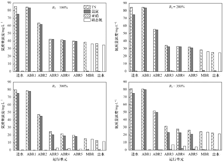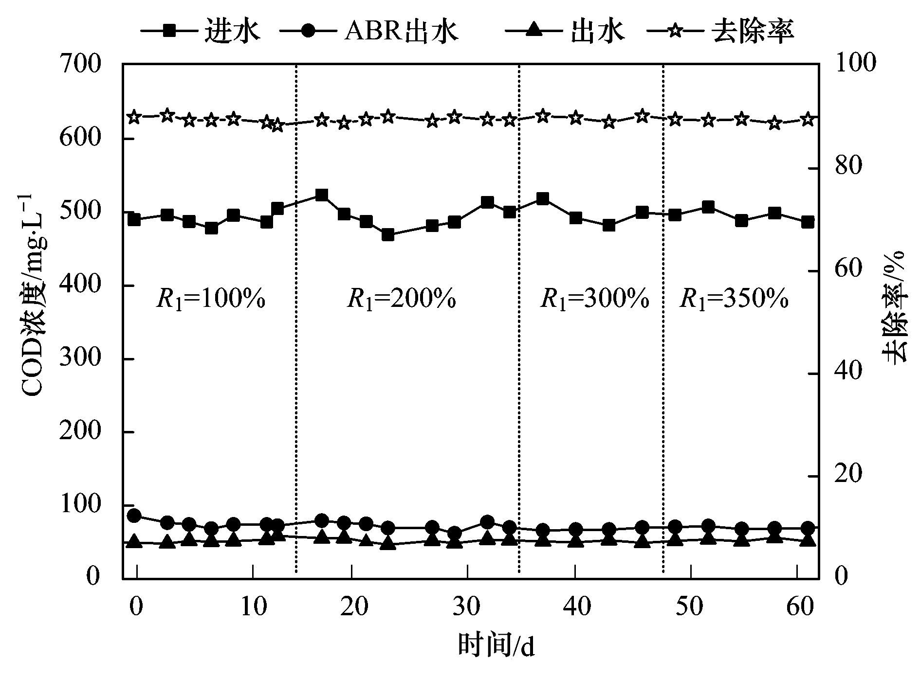 將MBR硝化液回流至ABR第3隔室,其回流比(R1)分別設置為100%、 200%、 300%和350%; 設置ABR第5隔室污泥回流至ABR第2隔室,其污泥回流比(R2)為100%. 本研究在對R1優(yōu)化后,在最優(yōu)R1條件下對R2進行優(yōu)化,設置3個不同R2,分別為80%、 100%和120%. 研究期間ABR-MBR組合工藝總HRT為9 h,控制泥齡為15 d.
