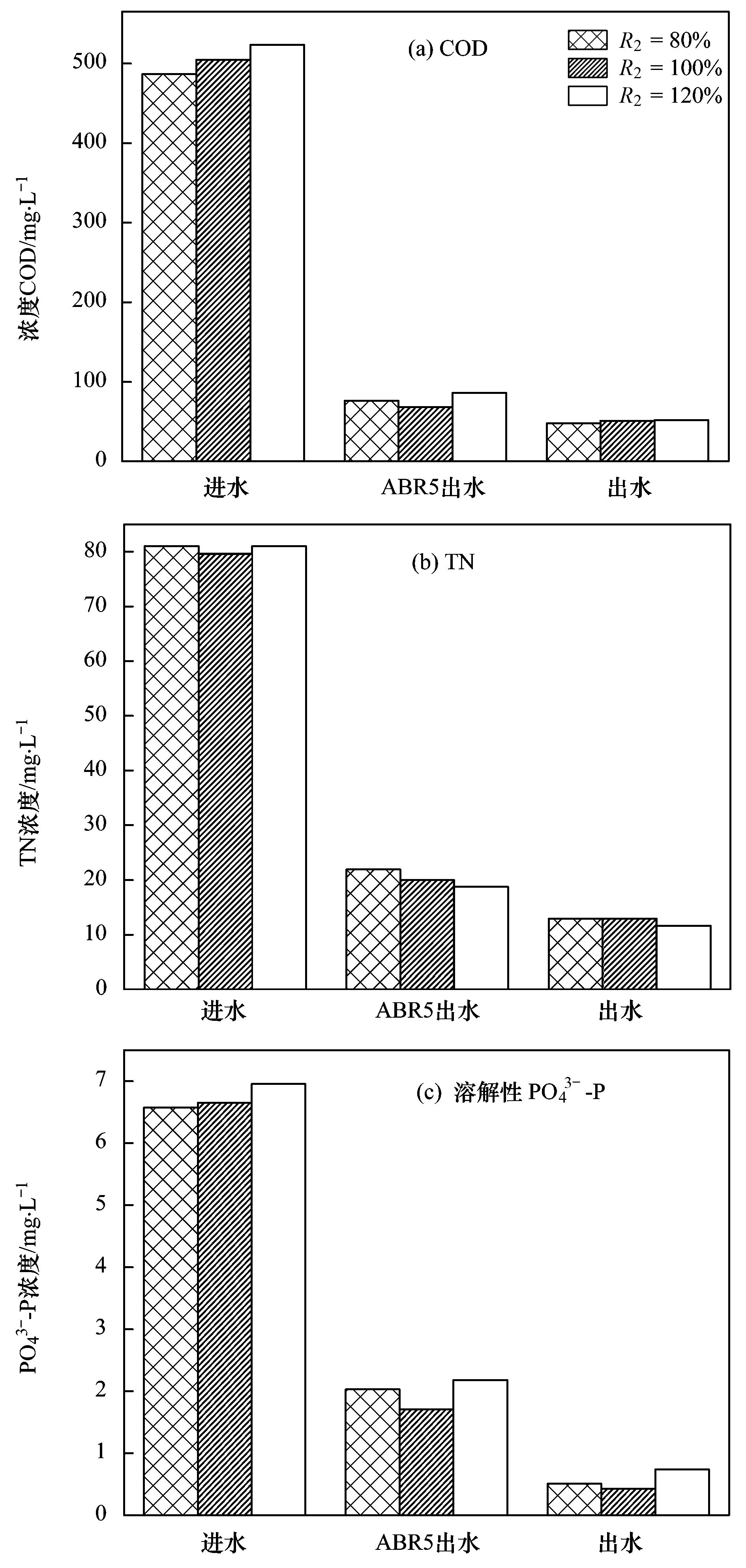 ABR段HRT為6 h,ABR段有機負荷為2.0 kg·(m3·d)-1左右,在不同R1條件下,ABR-MBR組合工藝對COD去除效果如圖 2所示,進水穩(wěn)定在500 mg·L-1左右,ABR出水穩(wěn)定在80 mg·L-1以下,最終出水COD穩(wěn)定在50 mg·L-1左右,去除率穩(wěn)定在90%左右. 這表明有機物在ABR段得到充分利用. 本研究對COD的去除效果較文獻中A2/O-MBR工藝有明顯提高,這可能是由于本研究前期在ABR前端隔室馴化有成熟的厭氧顆粒污泥,從而進一步鞏固了COD的去除效果. 與傳統(tǒng)脫氮除磷工藝對COD去除途徑的不同之處在于,本研究中ABR第2隔室富集的反硝化除磷菌(DPB)充分利用經(jīng)ABR第1隔室充分水解產(chǎn)生的優(yōu)質碳源合成胞內多聚物(PHB)來實現(xiàn)COD的利用,PHB在缺氧段作為反硝化除磷菌的電子供體,實現(xiàn)一碳兩用. 在本研究中,前置ABR在改善碳源質量以供厭氧釋磷所需,又能夠有效降低厭氧出水COD濃度,利于后續(xù)MBR內進行充分的硝化反應.