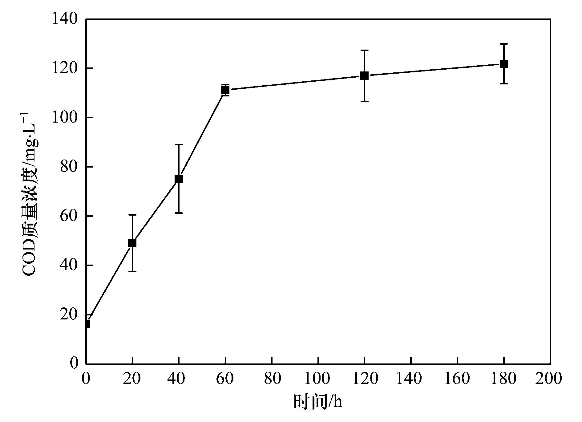 為了驗證分析②,設計以下實驗: 實驗結束后(120周期),從BAC反應器中取出100 g活性炭,加入1 L自來水中,加以攪拌,間隔取樣,測定水體中COD的質量濃度,確定BAC反應器中有機物是否發生了解吸,監測結果如圖 5所示. 從中可知,在進水無外加碳源的情況下,隨著攪拌的進行,水中COD質量濃度緩慢上升后達到平衡,平衡時水中COD質量濃度達127.56 mg·L-1. 由此說明BAC對水中有機物存在吸附作用,且吸附的有機物在水中碳源缺乏的情況下會得到解吸.