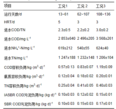 兩反應器共連續運行136 d. 其中1~12 d為啟動階段,HRT為5 d; 此后按照HRT和進水COD/TN分為3個工況,如表 1所示. 由于原水中COD/TN極低,因此3個工況均在進水中添加無水乙酸鈉調節進水. 其中: 工況1(13~61 d),進水COD/TN為2.3±0.5,HRT為5 d,污泥COD負荷約為0.10 kg·(kg·d)-1. 此階段污泥濃度增長緩慢,故全程未排泥,38 d開始穩定于約6300mg·L-1; 污泥性狀較差,泥水分離效果差. 工況2(62~107 d),碳源添加量不變,COD/TN為2.2±0.2,縮短HRT至3 d,初始污泥COD負荷提高至0.12 kg·(kg·d)-1,污泥濃度迅速增長至約7 500mg·L-1,泥水分離較差; 而后自85 d開始間歇排泥(平均SRT為77 d),最終IASBR和SBR中的MLSS分別穩定在6 100mg·L-1和5 700mg·L-1,污泥性狀改善,泥水分離性能顯著提高. 工況3(108~136 d),提高進水COD/TN至3.0±0.2,保持HRT為3 d,未進行排泥,IASBR和SBR的污泥濃度分別達到7800mg·L-1和7100mg·L-1,相應的污泥COD負荷分別為0.15 kg·(kg·d)-1和0.17 kg·(kg·d)-1,泥水分離好,污泥沉降性佳.