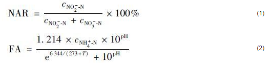 COD、 氨氮、 亞硝態氮、 硝態氮、 TN、 TP、 堿度的分析依據標準方法. MLSS依據重量法測定. 總有機碳(TOC)采用TOC儀[SHIMADZU CORPORATION,TOC-VCSN)]測定. pH、 DO采用便攜式儀器(DKK-TOA CORPORATION,HM-30P、 DO-31P)測定. 活性污泥的氨氧化速率(AUR)和亞硝酸氧化速率(NUR)的測定參照文獻,比氨氧化速率(SAUR)和比亞硝酸鹽氧化速率(SNUR)分別為AUR和NUR與污泥濃度(MLSS)的比值. 另外,亞硝態氮積累率(NAR)用公式(1)計算[15]. 游離氨(FA)的質量濃度采用公式(2)計算: