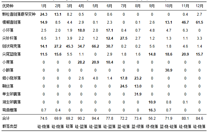 表 3 浮游植物優勢種月度平均百分比豐度1)/%