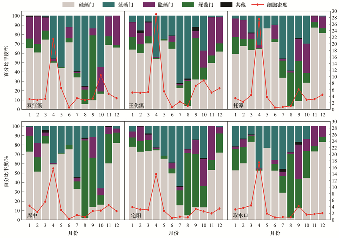 從浮游植物相對豐度(圖 2)來看,湯浦水庫占主導地位的是硅藻門、藍藻門、綠藻門和隱藻門,其他3門(裸藻門、金藻門和甲藻門)合計所占比例均 < 5%.與浮游植物密度類似,各采樣點的浮游植物門類組成具有較相似的時間變化:硅藻門在1~6月、11和12月占較高比例,相對豐度為44.4%~87.4%,僅處于水庫上游的雙江溪5月和王化溪11月低于50%;藍藻門在4~10月占較高比例,平均相對豐度為13.6%~58.9%;綠藻門在8月和9月占較高比例,平均相對豐度分別為51.8%和50.7%;隱藻門在1~2月和9~12月平均相對豐度為11.4%~25.3%.