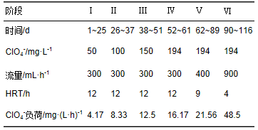 實驗運(yùn)行調(diào)控參數(shù)如表 1,前4個階段水力停留時間(HRT)為12 h,ClO4-的濃度由50 mg·L-1依次增加到100、 150、 194 mg·L-1,然后ClO4-濃度穩(wěn)定在194 mg·L-1,減少HRT分別為9 h和4 h,共分為6個階段. 每個階段內(nèi),定時監(jiān)測進(jìn)出水各離子濃度、 pH值和堿度等指標(biāo),待出水ClO4-濃度連續(xù)4 d去除率在96%以上,則改變條件開展下一階段的實驗.