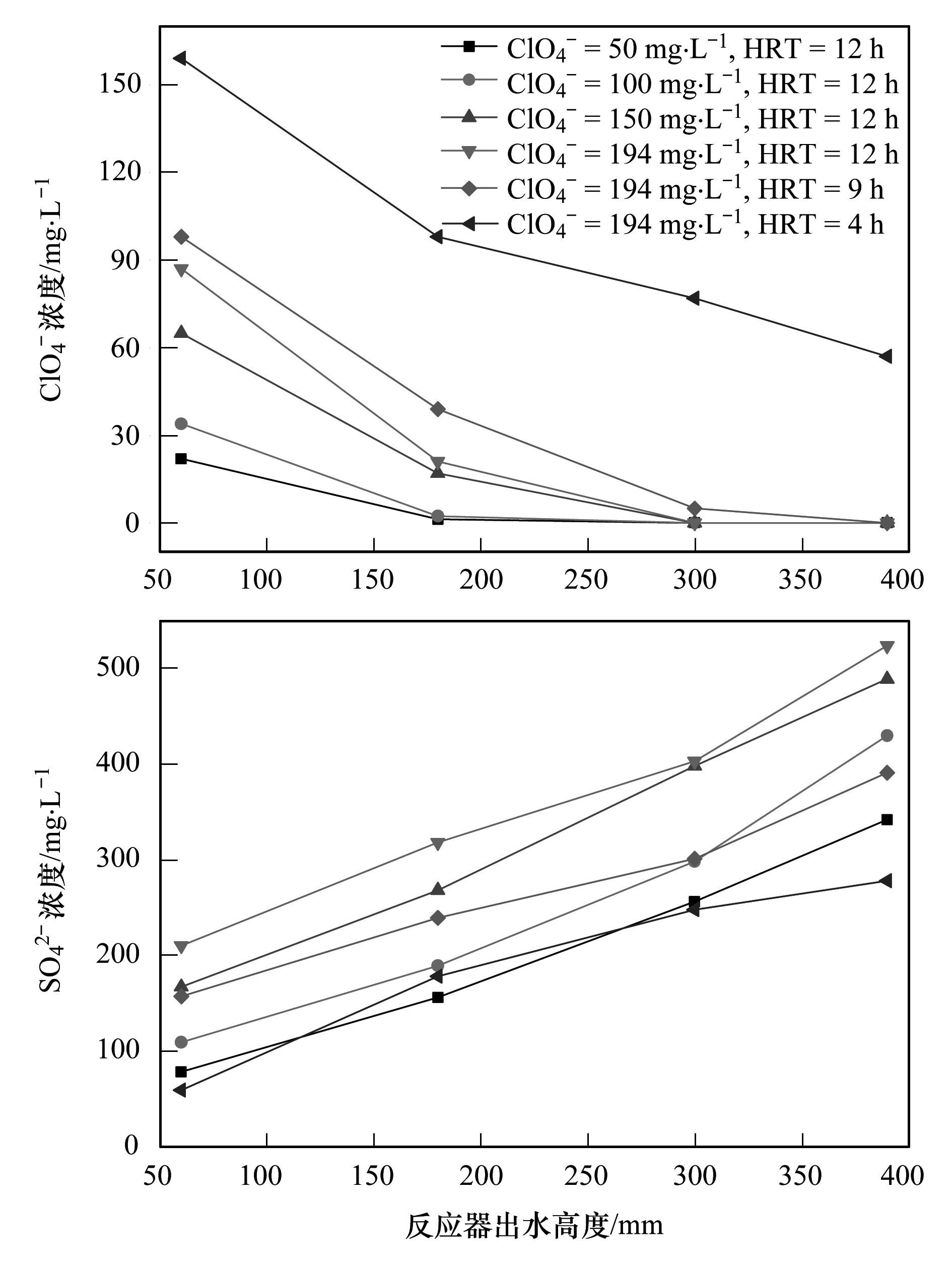 圖 5 高氯酸鹽及硫酸鹽濃度隨反應(yīng)器出水高度的變化