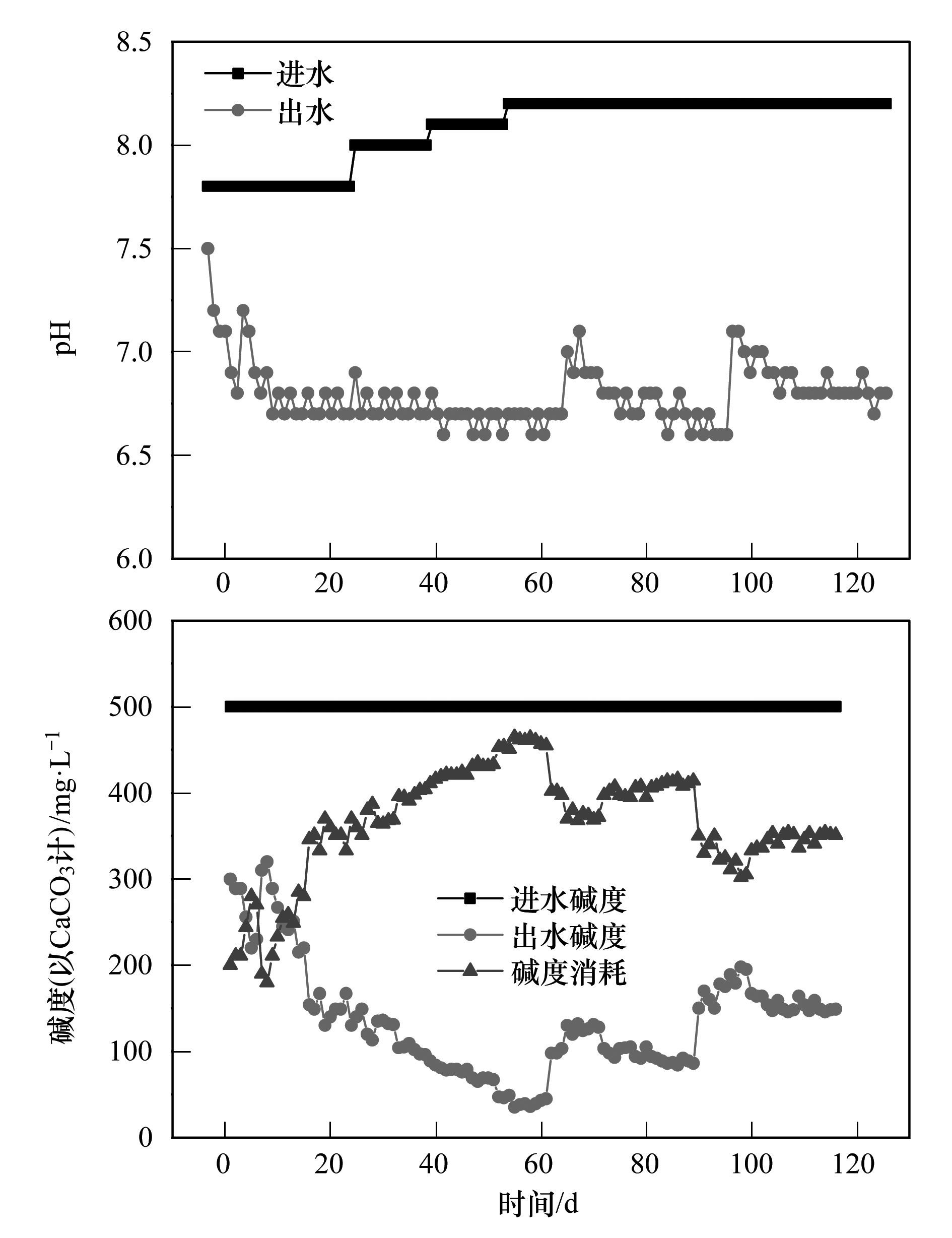 圖 3 硫自養(yǎng)反應(yīng)器中pH及堿度的變化