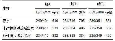 表 4列出了二級出水經未改性膜和改性膜處理后吸收峰的位置和峰強度. 從中可以看出,相比原膜,CNTs改性膜對峰A、 T1和T2所代表物質的去除率分別提高了2.8倍、 1.1倍和1.4倍. 同樣,從圖 9(c)中可以看出,二級出水經改性膜處理后已無明顯吸收峰. 這表明相比未改性膜,CNT改性膜對二級出水中的腐殖類和蛋白質類物質去除能力明顯提高.