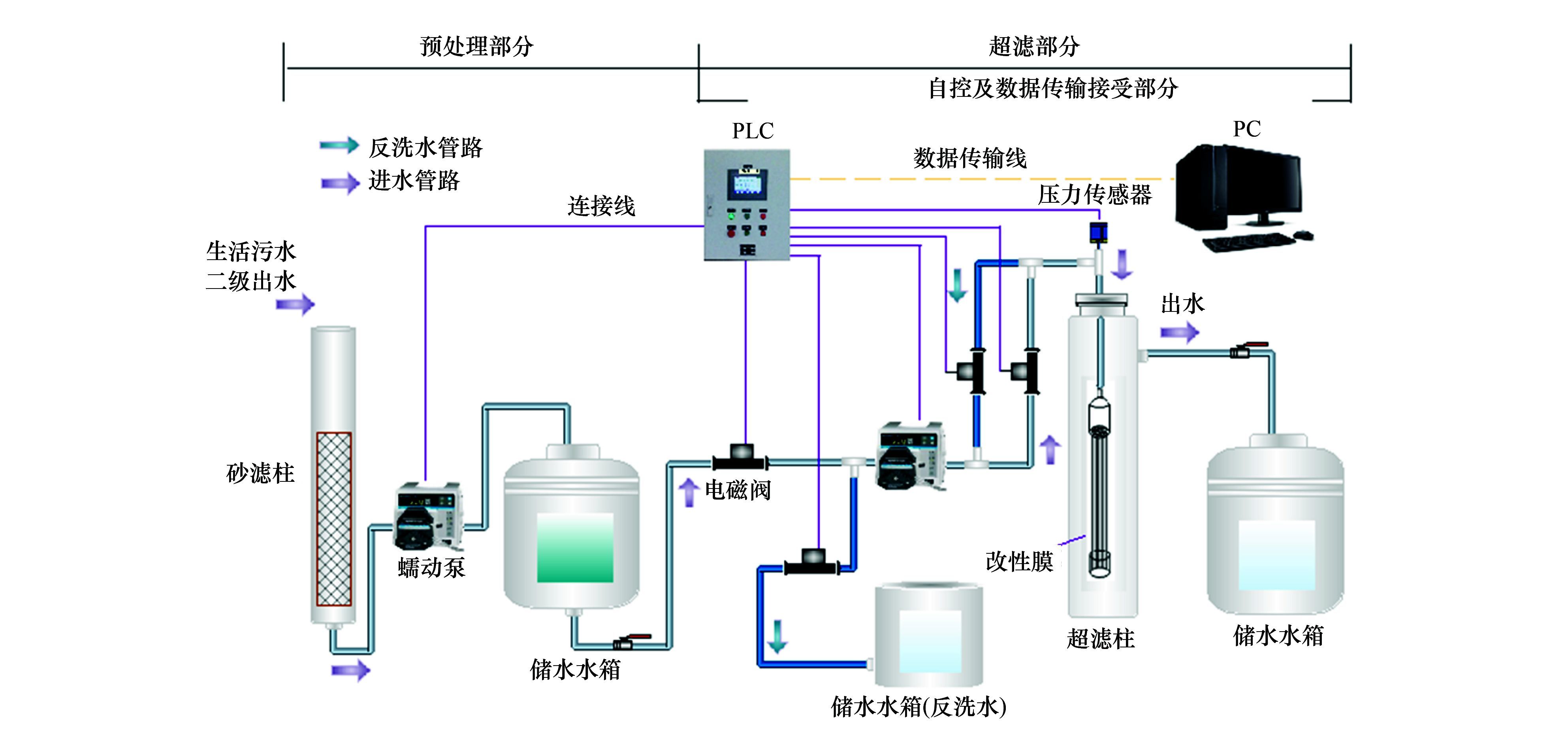 本研究中膜改性實驗和超濾實驗均在連續流裝置中完成,該裝置采用恒流-死端方式運行. 該系統對跨膜壓差TMP(MPa)、 過濾流量Q[L·(m2·h)-1]、 反洗周期Tf(min)、 反洗時間t(min)、 反洗通量q[L·(m2·h)-1]等操作條件進行自動控制. 系統運行過程中自動采集并記錄跨膜壓差數據. 參考常規運行條件,將本實驗膜通量設定為100 L·(m2·h)-1,對膜組件采用反向流清洗,反洗周期Tf為60 min,反洗通量q為150 L·(m2·h)-1,反洗時間t為1 min. 利用跨膜壓差增量反映過濾過程中膜的污染情況. 連續流自動控制系統記錄每一周期運行結束時跨膜壓差TMPj(j為周期數),則每一周期跨膜壓差增量為TMPj-TMP0. 連續流過濾裝置如圖 1所示.