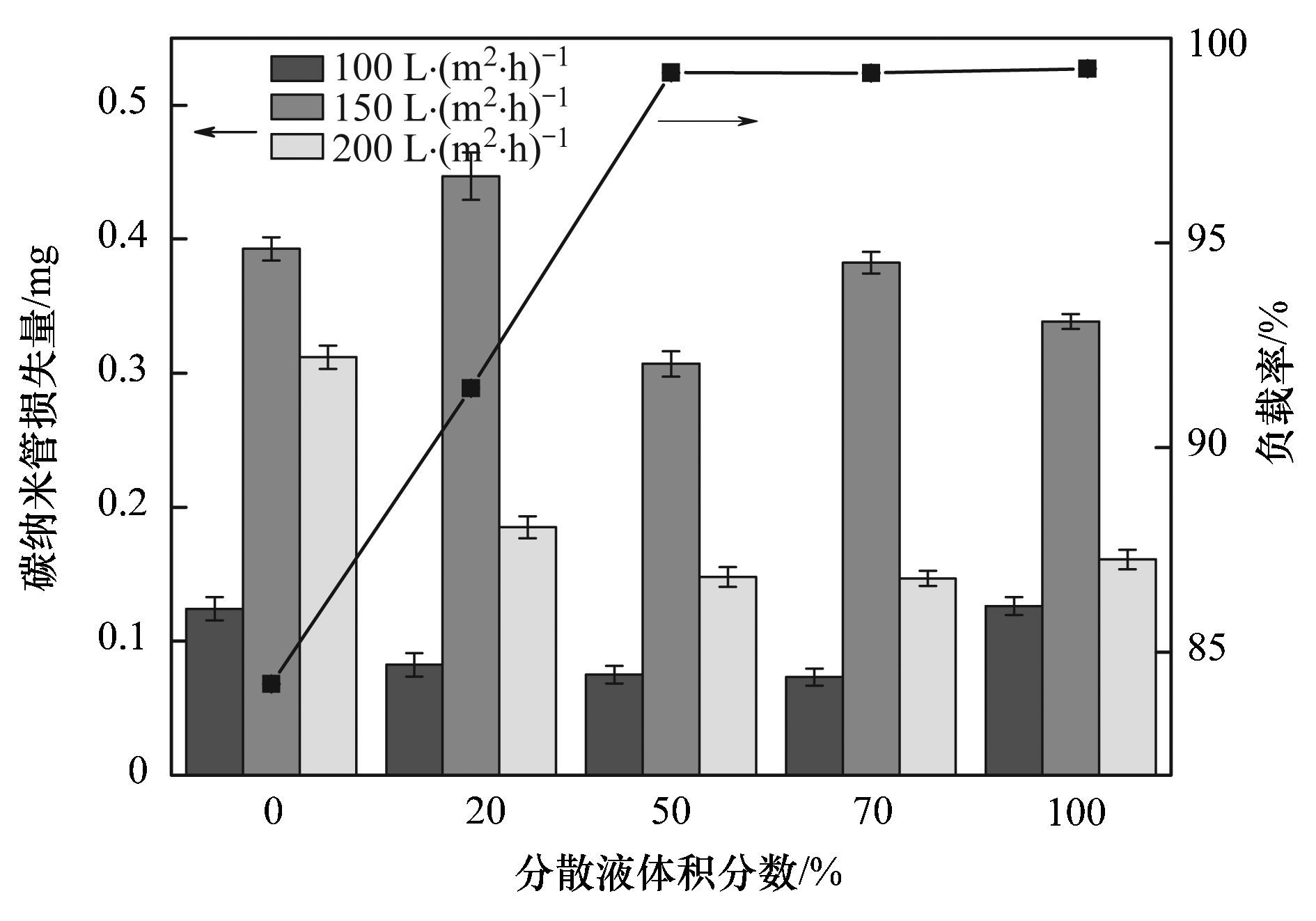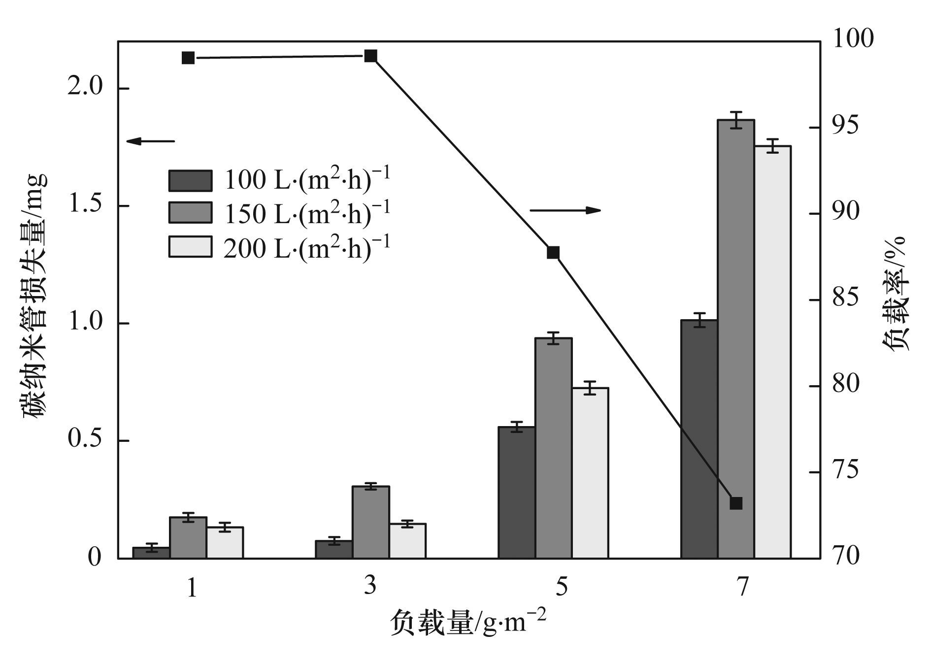 負載量對改性膜內表面負載率和CNTs層穩定性的影響如圖 7所示. 從中可看出,負載量為1和3 g·m-2時,負載率均高于99%,然而,隨著負載量的增大負載率降低,當負載量為5和7 g·m-2時,負載率分別降至87%和73%. 此外,與圖 3所示結果一致,當反洗通量為150 L·(m2·h)-1時,各改性膜CNTs損失量最多. 相同反洗通量條件下,負載量越大CNTs損失量越多:在反洗通量為150 L·(m2·h)-1條件下,負載量為1、 3、 5、 7 g·m-2制備的改性膜對應的CNTs損失量分別為0.17、 0.30、 0.94和1.86 mg,CNT損失量分別占該膜組件負載量的比例為3.4%、 2%、 3.7%和5.3%. 總體而言,在較強的水力清洗條件下清洗3 min后,各改性膜CNT損失量均較少,其中,負載量為3 g·m-2制備的改性膜CNT損失量最少.