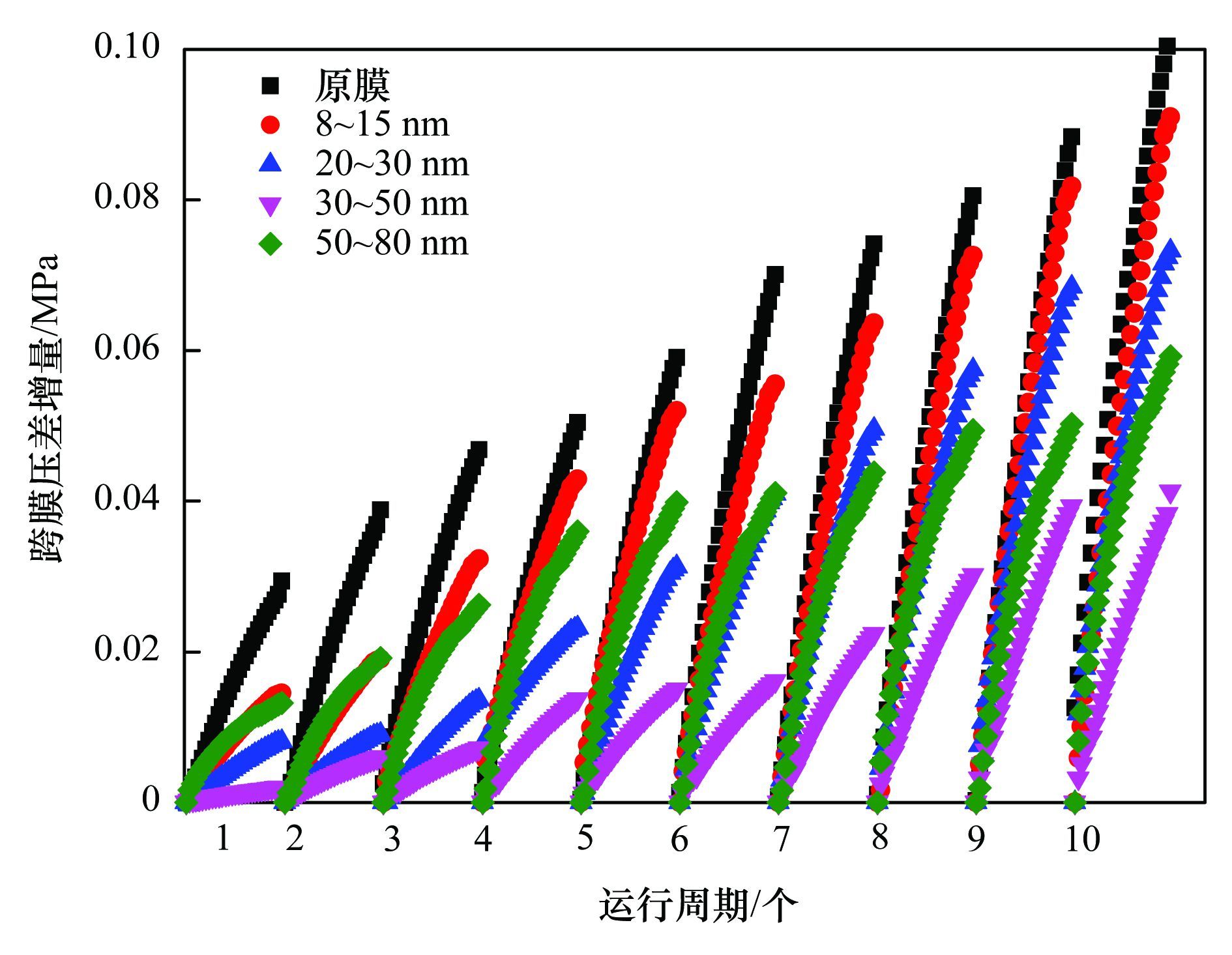 CNTs尺寸對改性膜的抗污染性能的影響如圖 4所示. CNTs的乙醇分散液濃度為50%,超聲時間25 min,負載量3g·m-2,CNTs的尺寸分別為8~15、 20~30、 30~50以及50~80 nm. 研究結果表明,不同尺寸CNTs制備的改性膜的抗污染能力均強于未改性膜. 對于改性膜而言,過濾初期(前2個周期)各改性膜TMP均增長緩慢,各改性膜TMP增量均小于0.02 MPa. 隨著過濾的進行,各改性膜TMP增量逐漸增加且增長趨勢明顯,但CNTs尺寸與TMP增量間并未表現出明顯規律. 運行至第10周期,過濾5 L水樣后,各改性膜組件間TMP增幅已表現出明顯差異,其中,利用30~50 nm制備的改性膜TMP增幅最小,為0.043 MPa; 利用8~15 nm制備的改性膜TMP增幅最大,為0.09 MPa; 利用20~30 nm和50~80 nm制備的改性膜TMP增幅分別為0.072 MPa和0.059 MPa.
