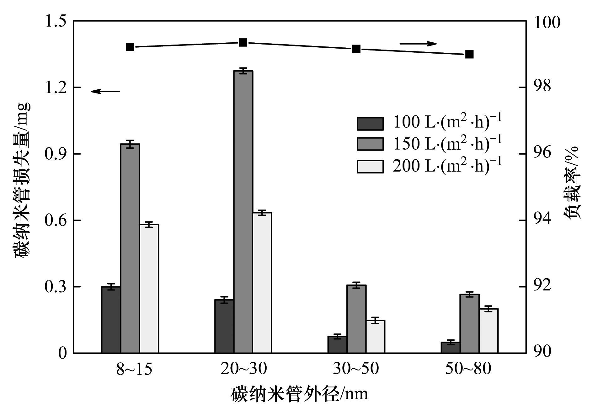 圖 5顯示了CNTs尺寸對負載率和改性膜內表面CNTs層穩定性的影響. 從中可以看出,盡管所有改性膜的負載率均高于99%,但利用外徑為30~50 nm和50~80 nm制備的改性膜負載率略低于8~15 nm和20~30 nm制備的改性膜. 此外,與圖 3所示一致,當反洗通量為150 L·(m2·h)-1時,各改性膜CNTs損失量最多. 從圖 5還可看出,相同反洗通量條件下,CNTs尺寸與CNTs損失量間無明顯規律:在反洗通量為150 L·(m2·h)-1時,利用30~50 nm和50~80 nm制備的改性膜CNTs損失量大致相同,且均小于0.3 mg,該損失量遠小于利用8~15 nm和20~30 nm制備的改性膜CNTs損失量0.94和1.27 mg.