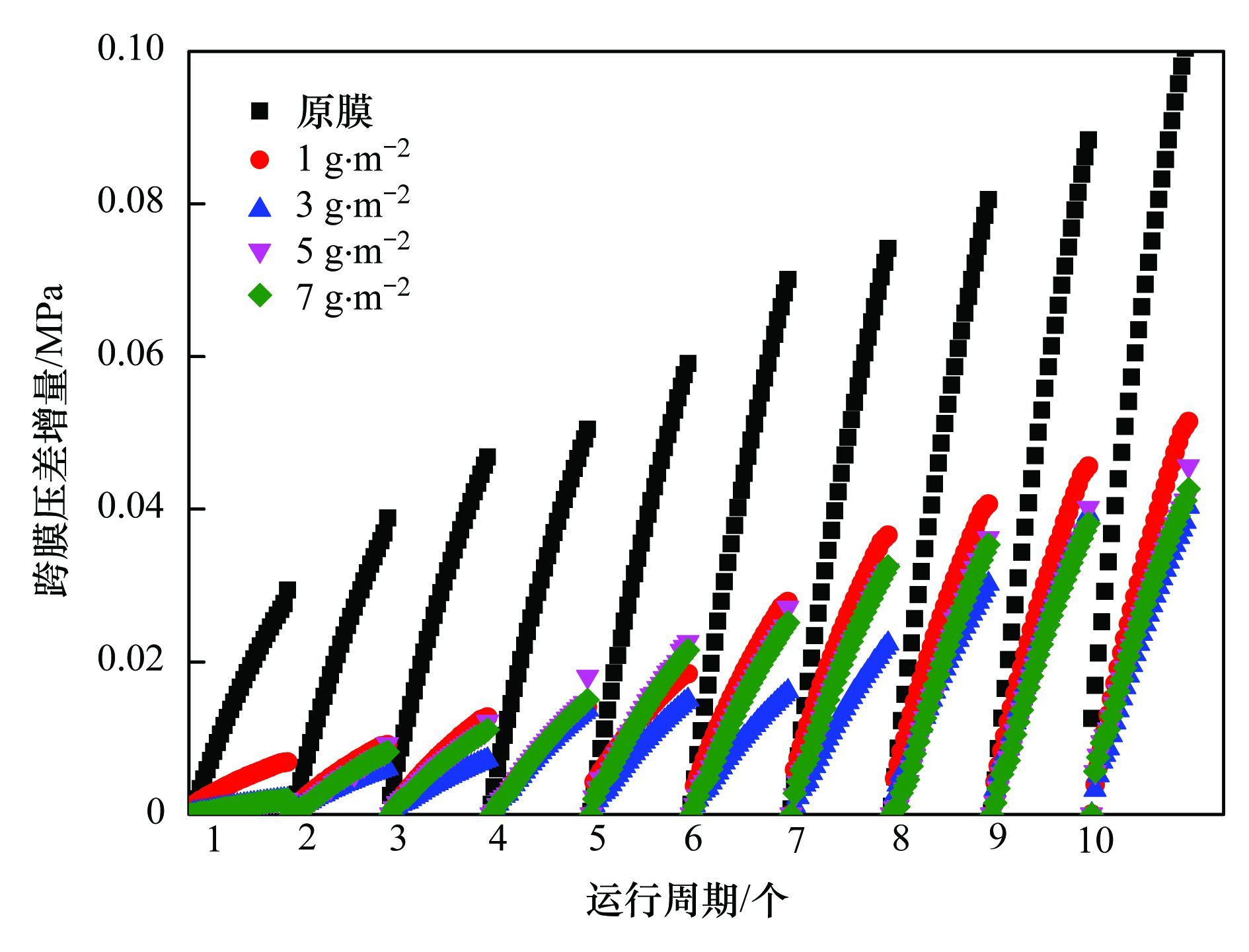 負載量對改性膜抗污染性能的影響如圖 6所示. 乙醇分散液濃度為50%,CNTs尺寸為30~50 nm,超聲時間為25 min,所選負載量分別為1、 3、 5、 7 g·m-2. 從中可以看出,不同負載量下,所有改性膜的抗污染性能均明顯好于未改性膜. 對于改性膜而言,過濾初期(前4個周期)各改性膜TMP均增長緩慢,其TMP增量均小于0.02 MPa. 隨著過濾的進行各改性膜TMP增量逐漸增加,但增長趨勢均較緩,運行至第10周期,過濾5 L水樣后,各改性膜TMP增幅并未表現出明顯差別. 負載量為1 g·m-2的改性膜跨膜壓差增量最大,為0.053 MPa,隨著負載量的增大,負載量為3、 5、 7 g·m-2對應的改性膜跨膜壓差增量基本一致,約為0.047 MPa.