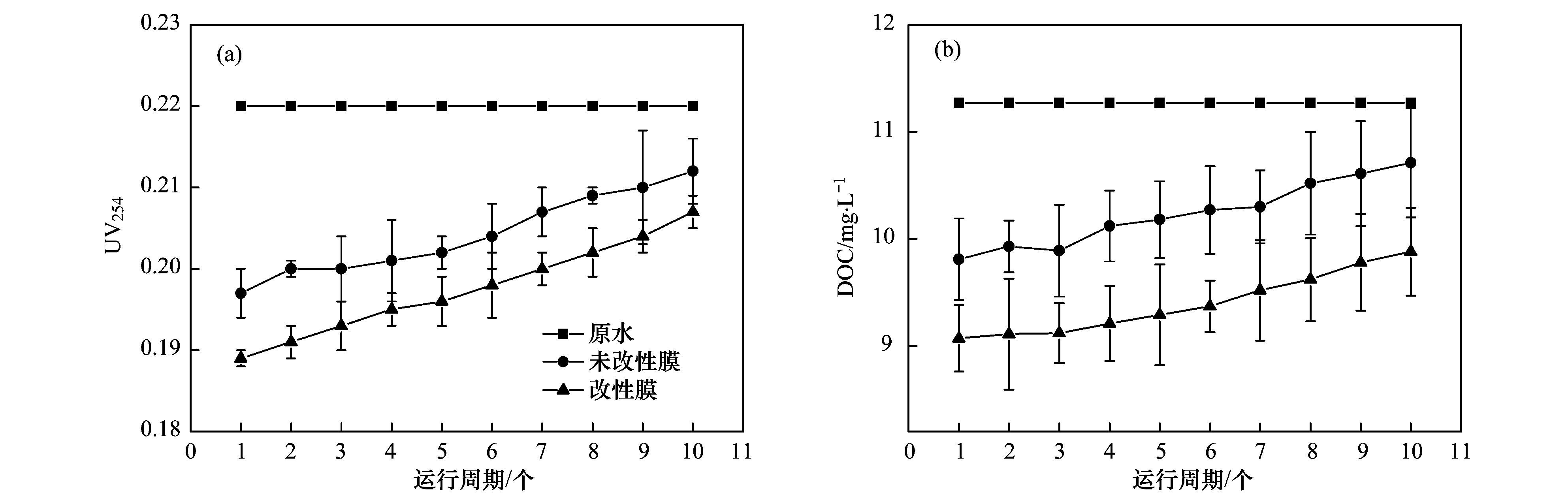 從圖 8(a)中可以看出,整個運行過程中,改性膜對UV254的去除率明顯高于未改性膜. 運行初始階段,原水UV254為0.22,經改性膜和未改性膜過濾后出水中UV254分別為0.191和0.198,即改性膜和未改性膜對UV254的去除率分別為13.4%和9.8%,相比于未改性膜,改性膜對UV254去除率提高了37%. 隨著運行的進行,兩者對UV254的去除率均逐漸降低,且二者降低趨勢較一致,出水中UV254逐漸升高,運行至第10周期,過濾5 L水樣后,經改性膜和未改性膜過濾后出水中UV254分別為0.206和0.213,即改性膜和未改性膜對UV254的去除率分別為6.1%和3.2%,較初始階段的去除率分別降低了7.3%和6.6%.