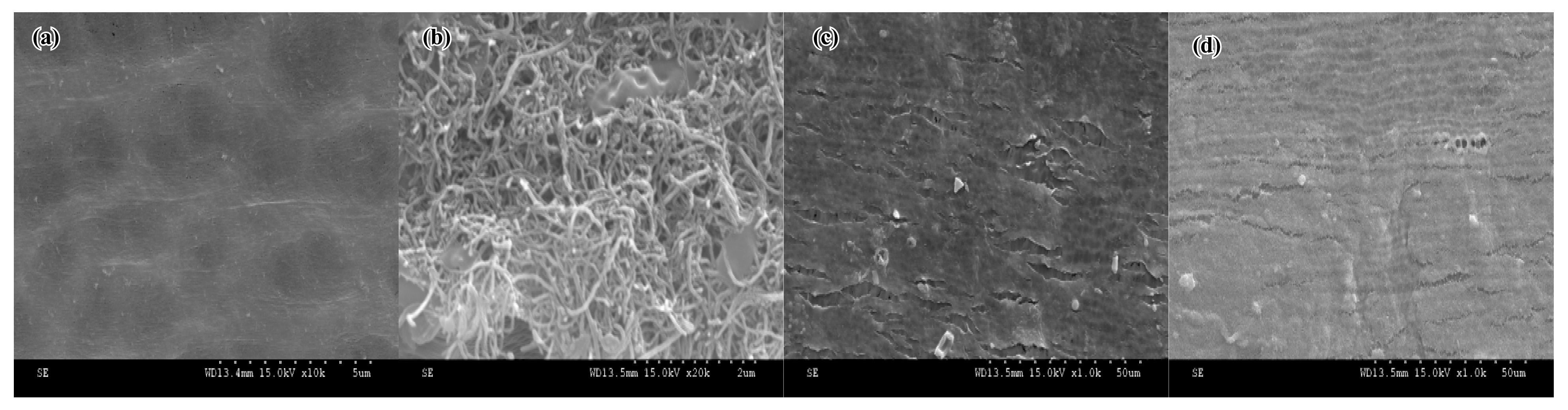 (a)原膜(×10 000); (b)CNT改性膜(×5 000); (c)過濾二級出水的原膜(×10 000); (d)過濾二級出水的CNT改性膜(×10 000)