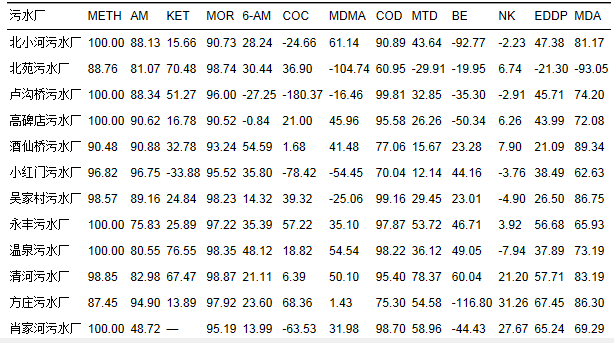 表 9 北京市12家污水廠對常見違禁藥物及其代謝物的去除率/%