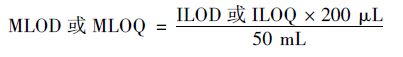 按照ICH的規定,儀器檢出限(ILOD)和定量限(ILOQ)分別以3倍信噪比(3S/N)和10倍信噪比(10S/N)確定. 0.01、 0.05、 0.1和0.5 ng·mL-1等低濃度混標上機測定,S/N為3時對應的濃度為儀器檢出限,S/N為10時對應的濃度為儀器定量限. 方法檢出限(MLOD)和定量限(MLOQ)通過以下公式計算得到: