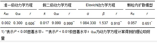 從Elovich模型的擬合結果可以看出,擬合效果較好,相關系數達到0.910(P < 0.01),驗證了化學吸附速率是Hg2+吸附控制步驟的結論.而從顆粒內擴散模型可以看出,擬合曲線沒有經過原點,由此表明內擴散并不是控制吸附過程的唯一步驟.總的來看,顆粒內擴散模型對實驗數據擬合的效果要好于準一級動力學模型,這說明內擴散對吸附過程的控制作用比外部傳質明顯.