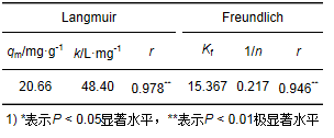 吸附等溫線揭示了在吸附平衡時,吸附質在液相和吸附劑內的分布情況.吸附等溫線可以反映吸附劑的吸附能力.為了更好地描述T/P復合材料對Hg2+的吸附性能,分別用Langmuir和Freundlich模型來擬合吸附過程.兩個吸附等溫方程的擬合結果見表 2.
