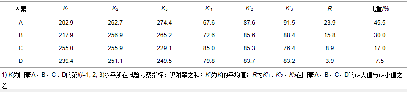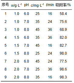 在單因素實驗的基礎上,進一步篩選優化,選擇4個因素3個水平進行正交試驗,確定T/P復合材料吸附Hg2+的最優條件. 4個因素分別是:T/P復合材料添加量w(A),g·L-1;溶液pH (B);溶液初始Hg2+濃度c(C),mg·L-1;吸附時間t(D),min.