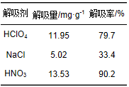在實際工業應用中,吸附劑的回收再利用是評價吸附劑性能的一個重要指標.為了進一步了解T/P復合材料吸附Hg2+后的回收情況,在最優吸附條件的基礎上進行解吸實驗.待吸附飽和后,取1 mL上清液測定Hg2+濃度,然后棄去上清液,再分別加入50 mL 0.01 mol·L-1 NaCl、1% HClO4和HNO3作為解吸劑,在磁力攪拌器上進行解吸.解吸2 h后,各取1 mL樣液測定Hg2+濃度,計算解吸率與解吸量,并比較得出最佳解吸劑.