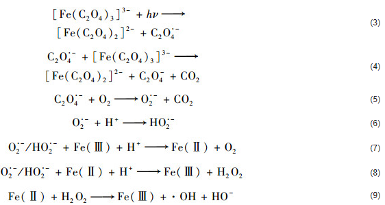 根據Liu等的報道,O2·-也是Fe (Ⅲ)-草酸絡合物體系中一種重要的活性氧物質.由公式(3),Fe (Ⅲ)-草酸絡合物可以光解產生C2O4·-,C2O4·-可以與O2反應生成O2·-,O2·-同樣可以降解有機物,使其形態結構發生改變.本研究以氯化氮藍四唑(NBT)為O2·-分子探針,由以下公式計算: